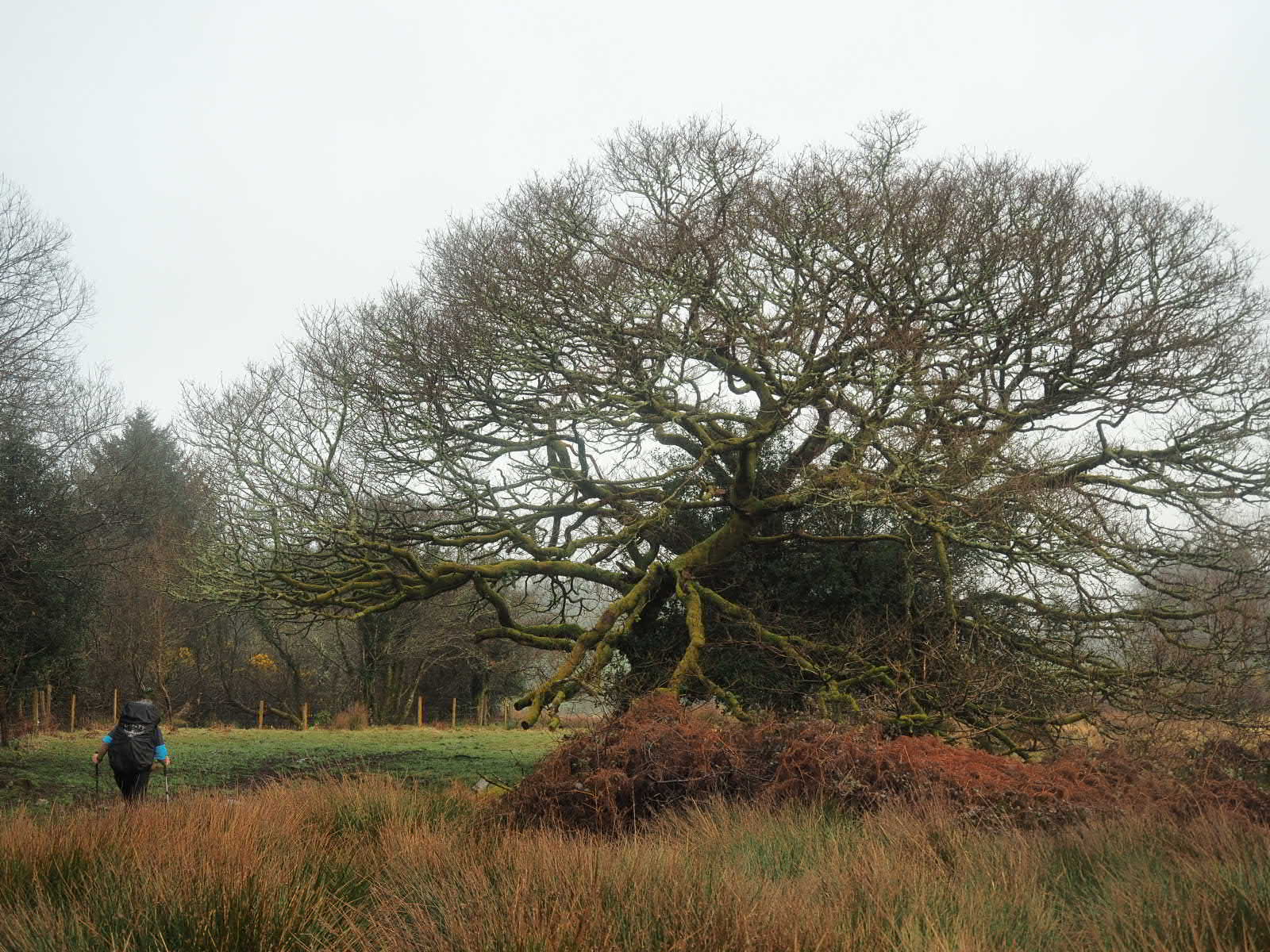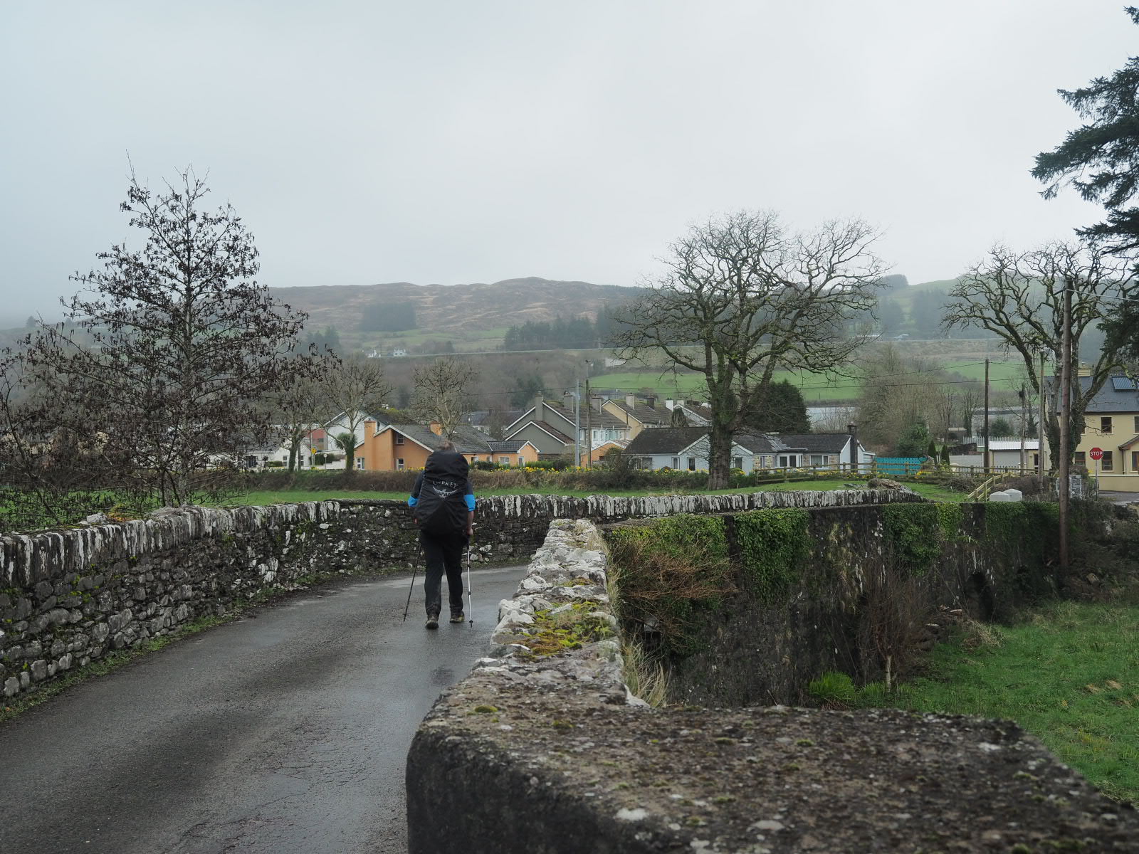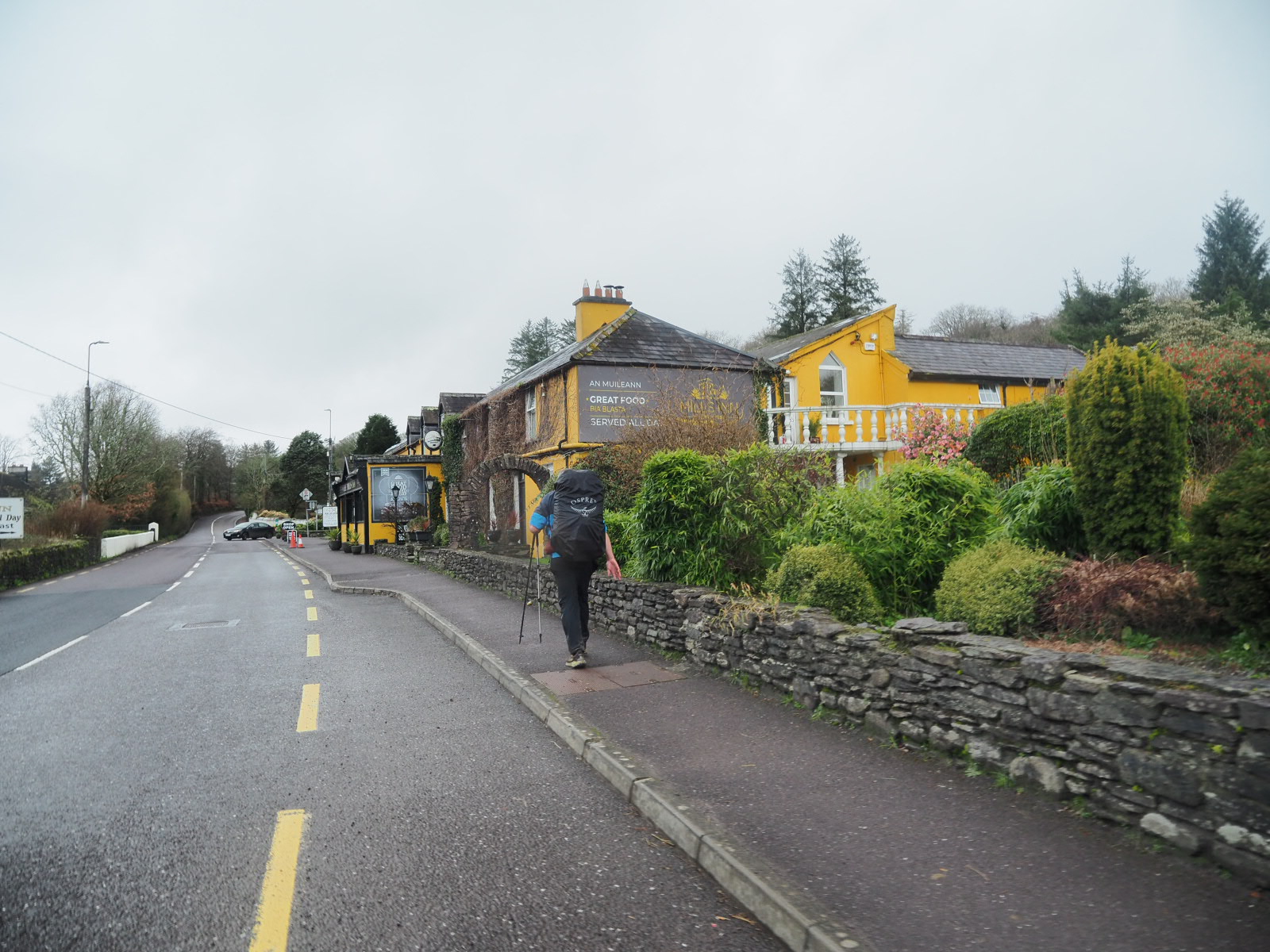 we enjoy the walk with beautiful old trees and a church ruin with a big mossy tree in the middle. We seem to go into another boggy landscape, but when we get to the style, it leads onto the road! That’s a surprise! We make good progress And around 13.00 (and 20 km done!) we enter the village of Baile Bhuirne (Ballyvourney). We can go left to our hotel, or right to the supermarket. We decide to start with the supermarket and get some lunch, before we get to our final stop of the day. The village is long, and the supermarket slightly further than we’d have wished for. We get some nice bread, bananas, ham and cheese and take a sneak preview at the options for our resupply tomorrow.