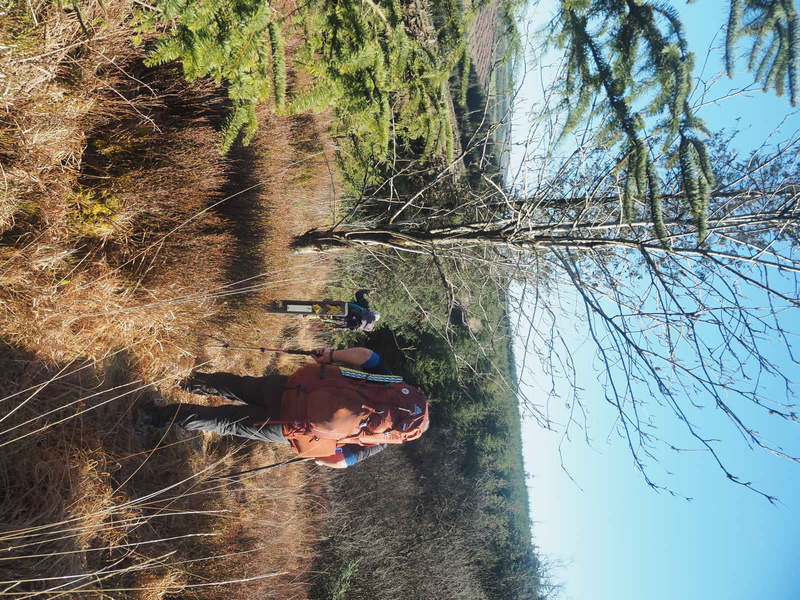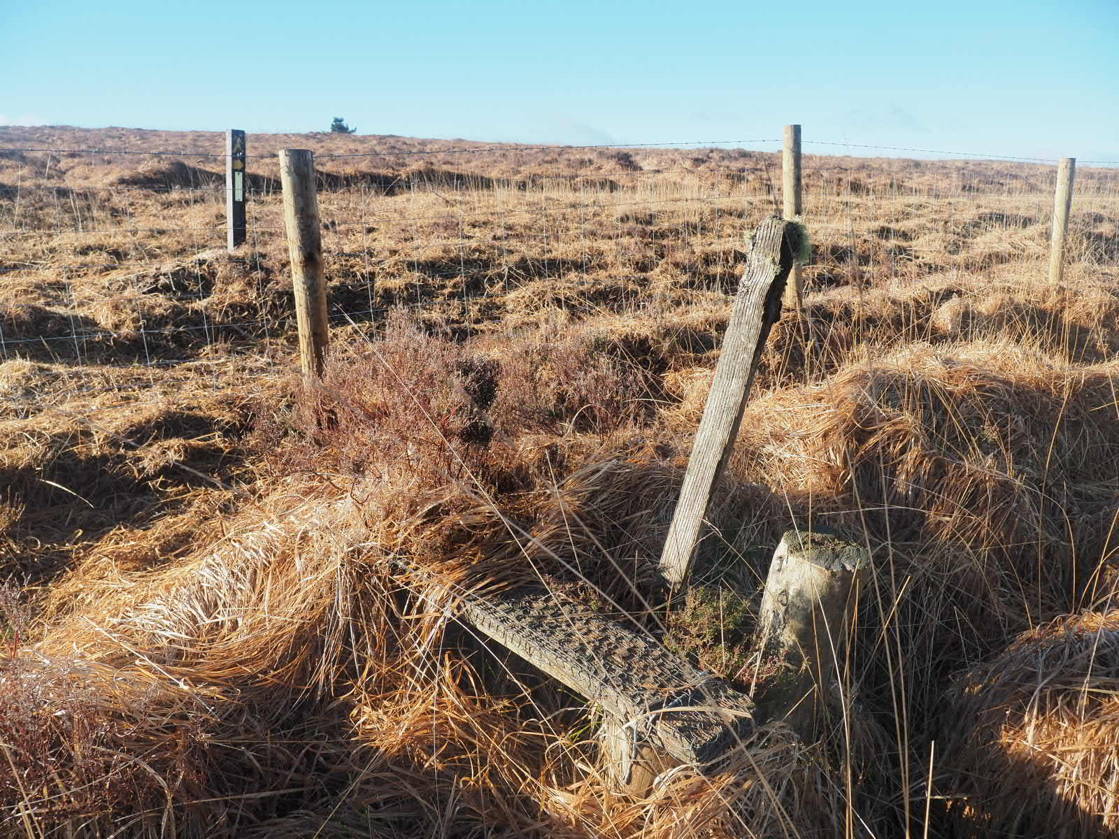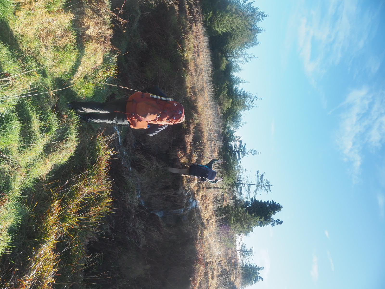 We start our hike in sunshine and keep this for quite a large portion of the day! We hike nice tracks, but o ce again, the trail offers Rein first hand experience of what we meant with ‘the trail was more like a river’, when he needs to climb up a little waterfall that appears to be the trail. After a boggy wet walk (this time in waterproof socks, so no wet and cold feet!) we come to a marker pointing left, across a brand new barbed wire fence, without a style. Well there is an old style, a meter or so outside of the fence….